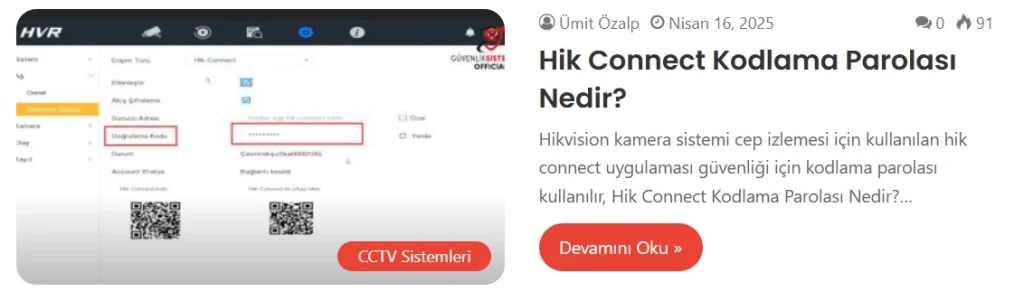 Güvenlik kamerası görüntülerinin hikconnect cep telefonu uygulamasından izlenebilmesi için hikconnect kodlama parolası bilinmelidir, dvr admin menüsünde ağ ayarlarına girildiğinde kodlama parolası görülebilir. Bu bölümden doğrulama kodu değiştirilerek cep izlemesi yapılabilir. Bu yazımızda daha detaylı anlattık.